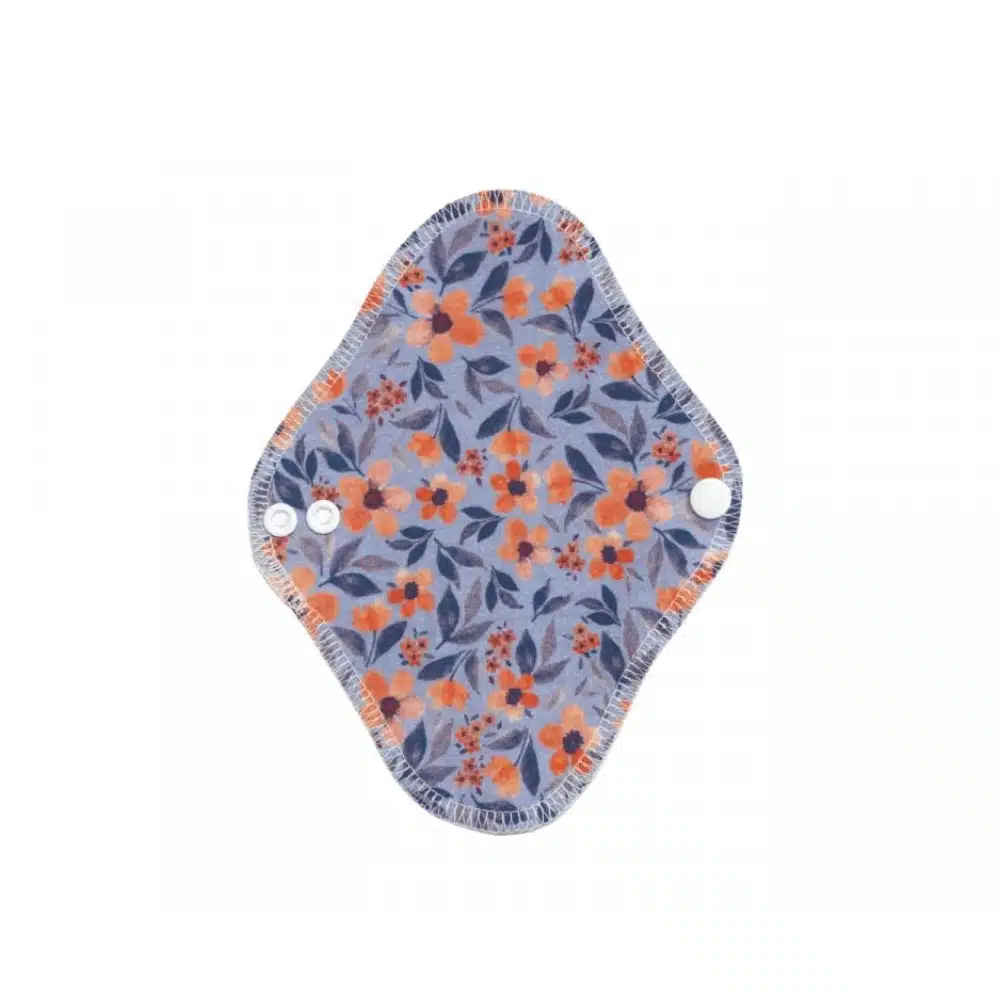 Dun inlegkruisje zonder lekdicht PUL laagje met oranje bloemen op een blauwe ondergrond