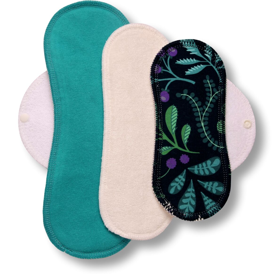 Met het label aan de onderkant, vouw je het maandverband om je slip heen en maak je het vast met de drukknoop.